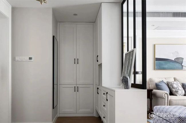 假如做了定制玄關(guān)柜,收納還是不夠用,這又該如何是好呢?不難,繼續(xù)從其他閑置區(qū)域著手,比如說(shuō)門后的空間。日常生活中,我們可以在門上或者門后空間,利用掛鉤+擱板的組合,打造玄關(guān)的第二收納區(qū)。當(dāng)然了,由于承重能力有限,只能放置一些小物件,比如說(shuō)衣服、包包、鑰匙等。同時(shí),無(wú)論是獨(dú)立款還是與玄關(guān)柜一體的換鞋凳,都可以將其內(nèi)部掏空,規(guī)劃一個(gè)小型收納區(qū)。對(duì)于有轉(zhuǎn)角的玄關(guān),可不要嫌棄雞肋,也是可以打造出強(qiáng)大的轉(zhuǎn)角柜。