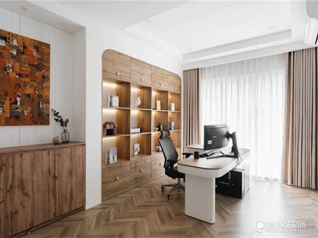 與家里的其他空間一樣,書房地面材料的選擇,也是在瓷磚和木地板之間做二選一。雖然瓷磚的整體性價(jià)比更高,尤其是耐磨、價(jià)格、易清理和可選性等方面。但是,瓷磚給人的感覺是冷冰冰的。如果書房采光條件不好,繼續(xù)任性鋪貼瓷磚,只會讓書房看起來更加冷清。相較于瓷磚,木地板則是給人一種溫暖的感覺,腳感特別舒適。另外,木地板也會給書房烘托出更加高貴的氣質(zhì)。當(dāng)然了,要是你家書房的采光條件特別好,也可以選擇鋪貼木紋磚。擔(dān)心腳感冷?鋪一層地毯。值得一提的是,無論是瓷磚還是木地板,鋪貼前都要做好地面找平。